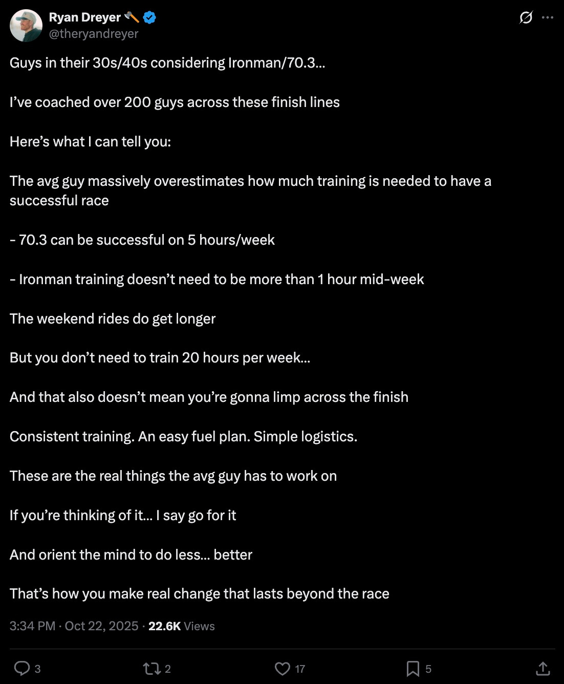 He’d just turned 30, averaged under 5 hours a week, and completed two 70.3s.